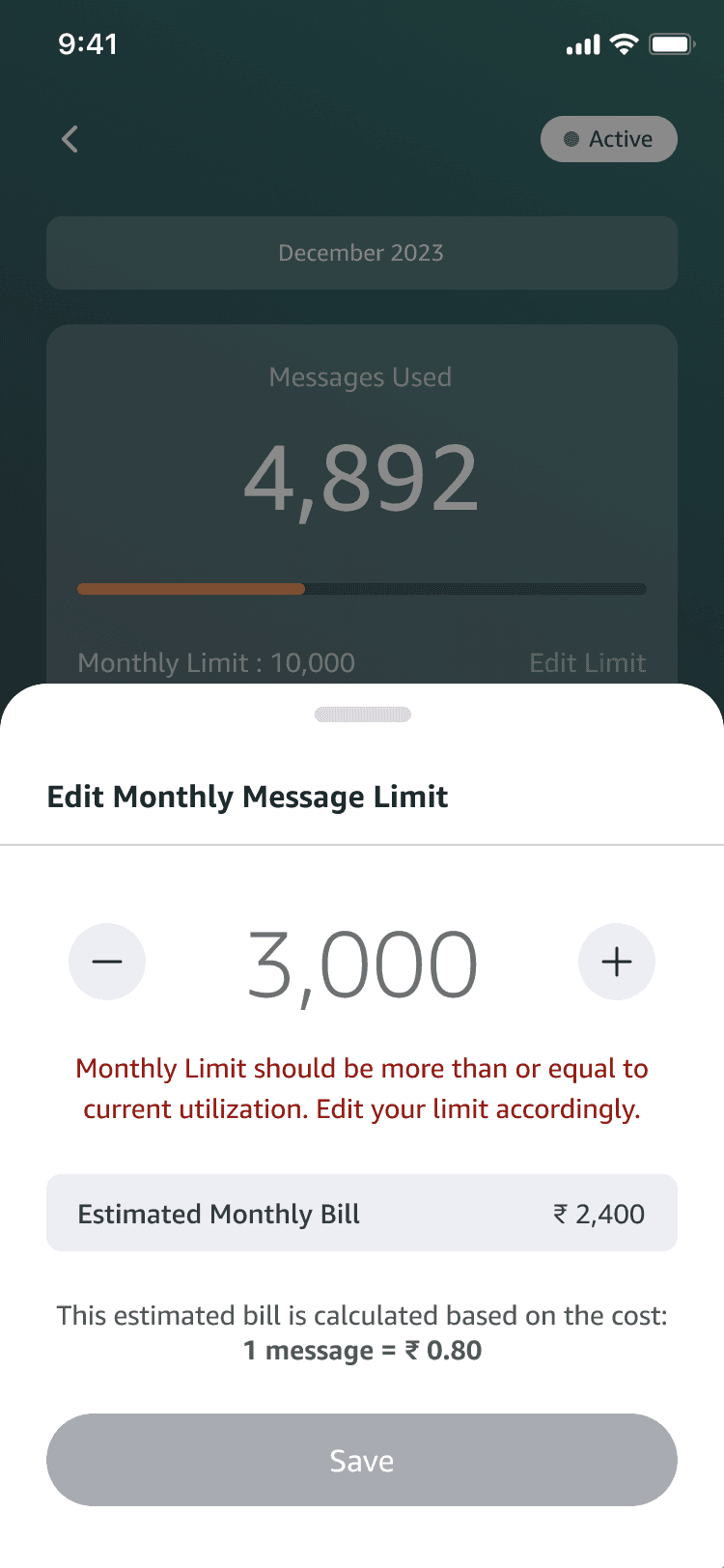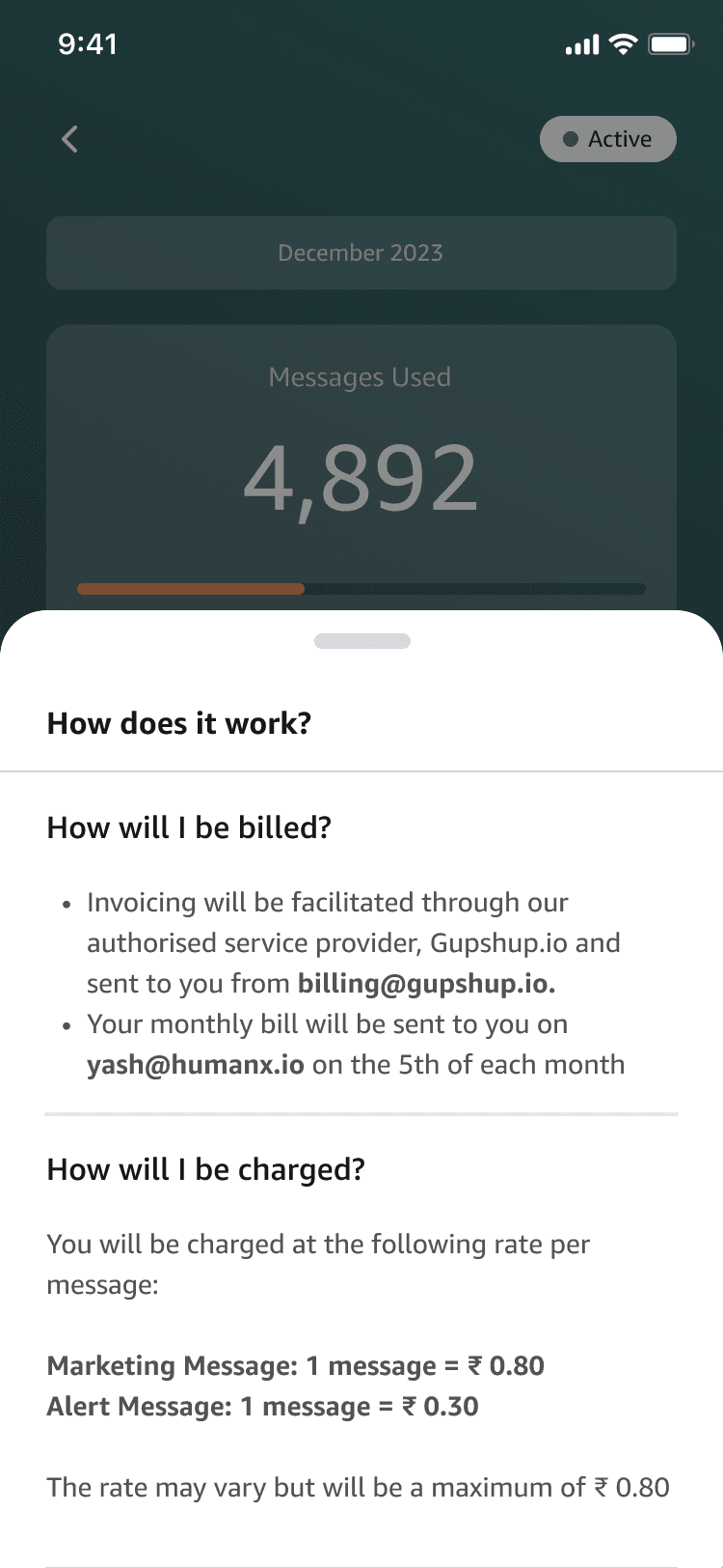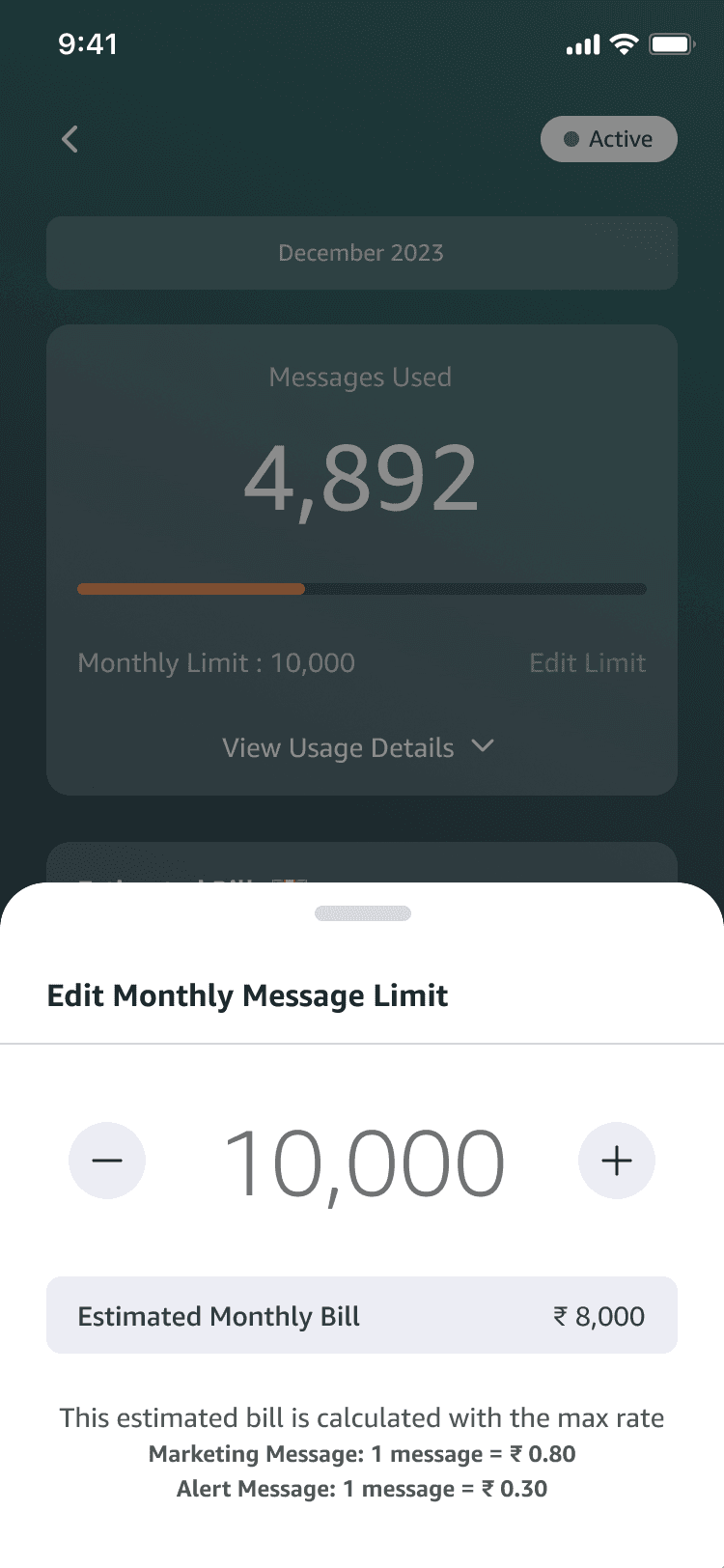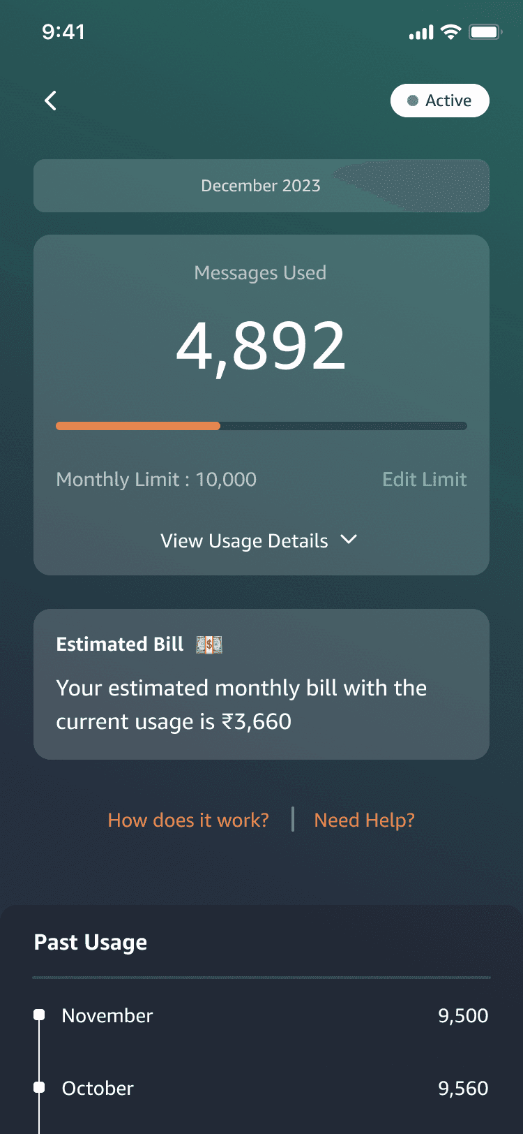 A post-paid wallet system allowed sellers to set a monthly message limit, helping them stay within budget while scaling campaigns based on performance. With clear visibility into usage, charges, and limits, sellers could manage costs transparently and avoid unexpected expenses.