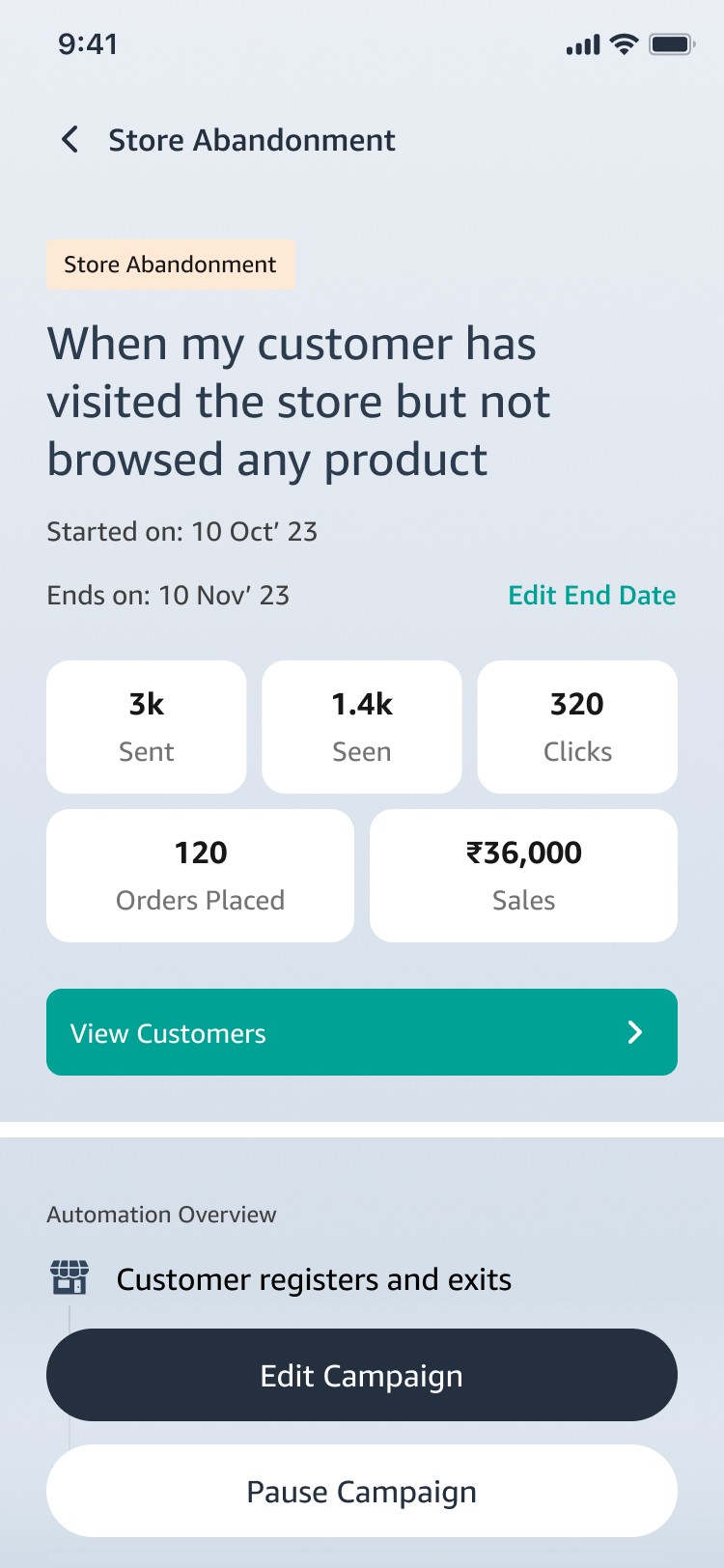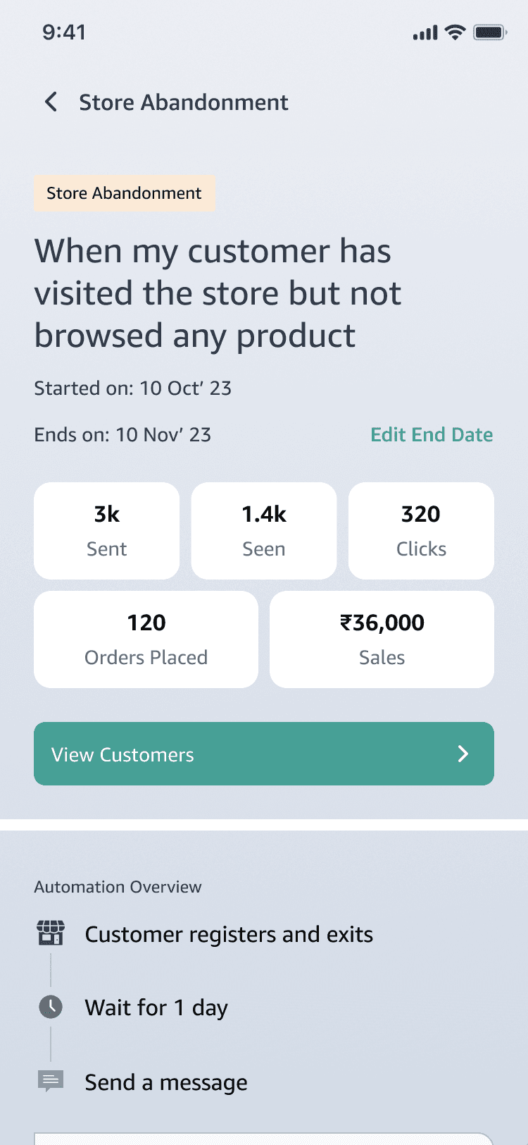 Created a sophisticated campaign management system on mobile with pre-approved templates that allowed sellers to activate, edit and manage campaigns on the go. Designed for automated campaigns triggered by customer behaviour, broadcast messages and dynamic order alerts.