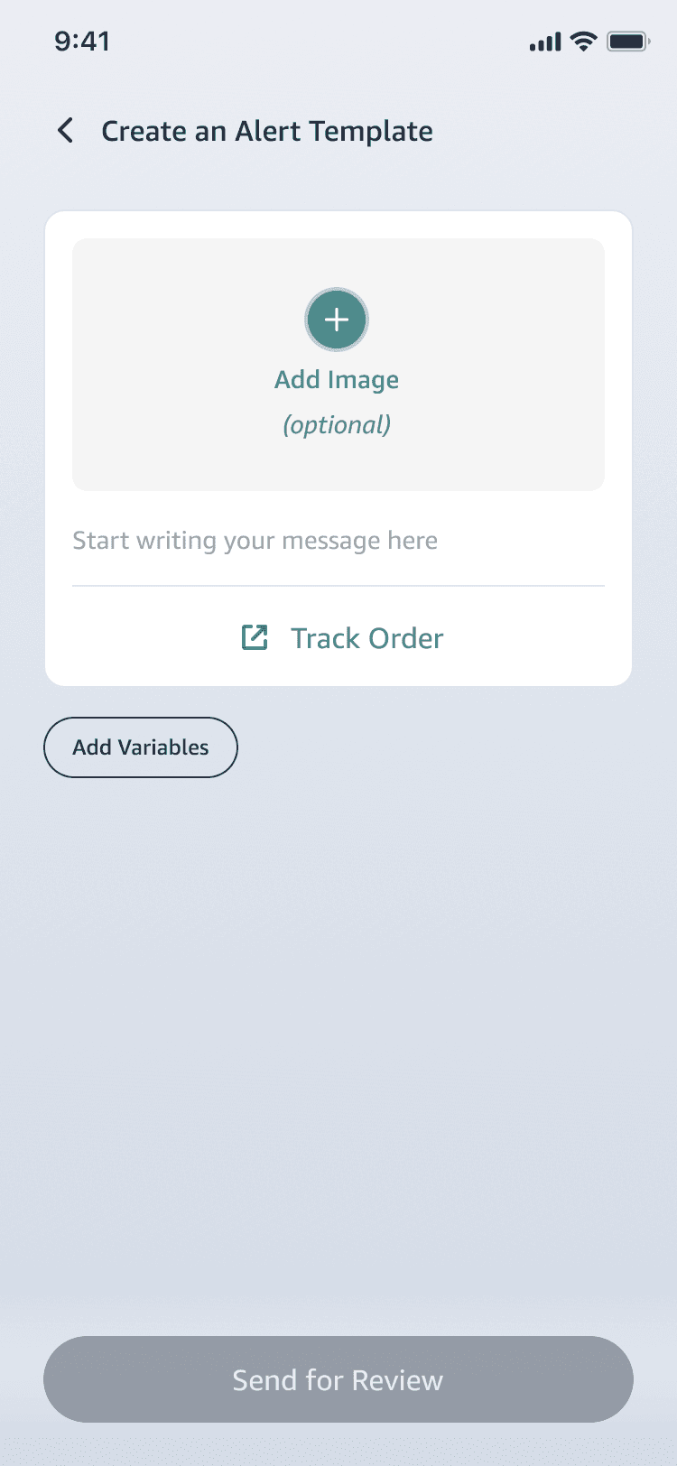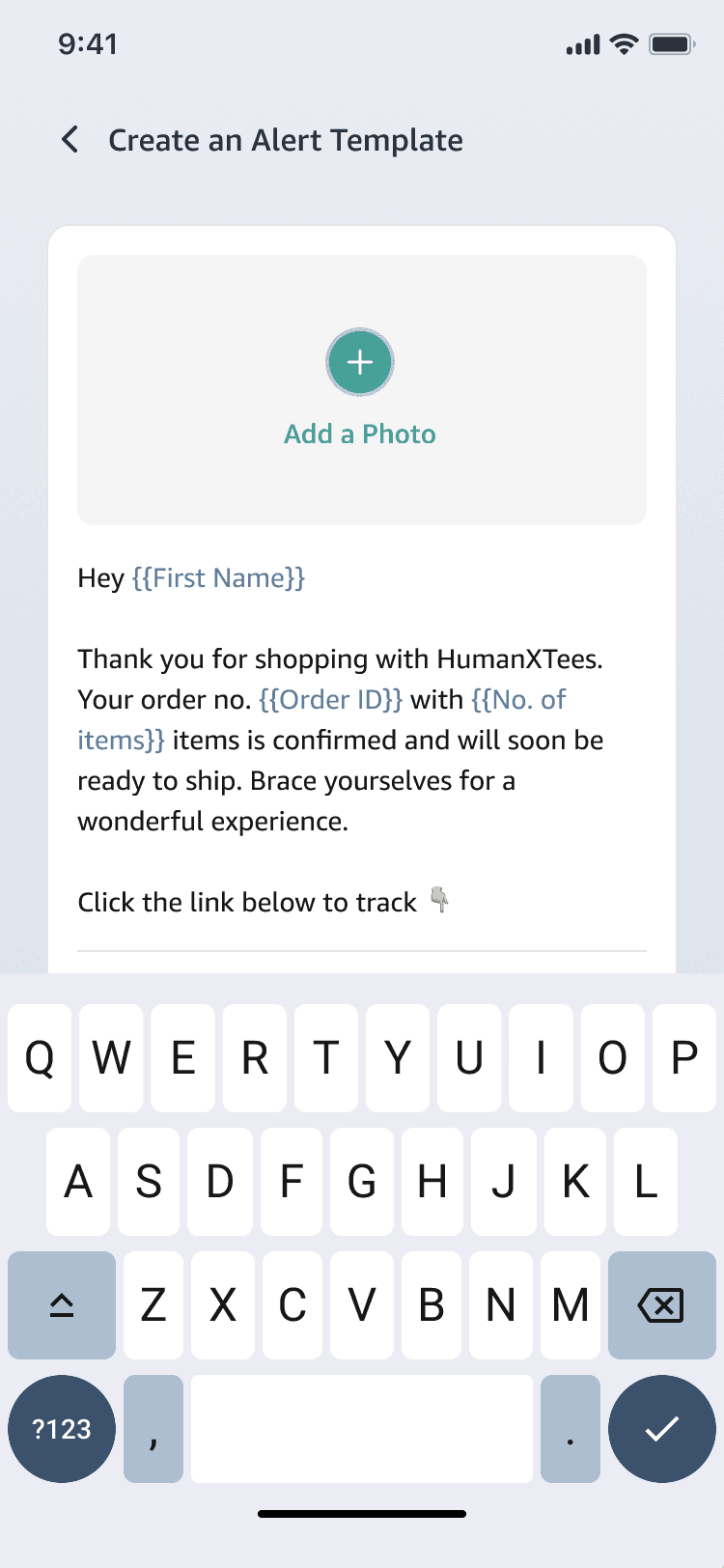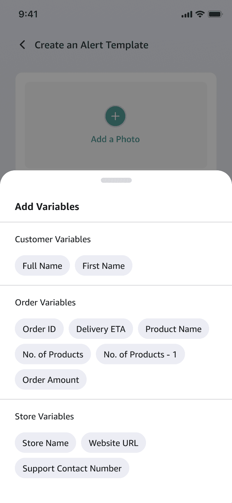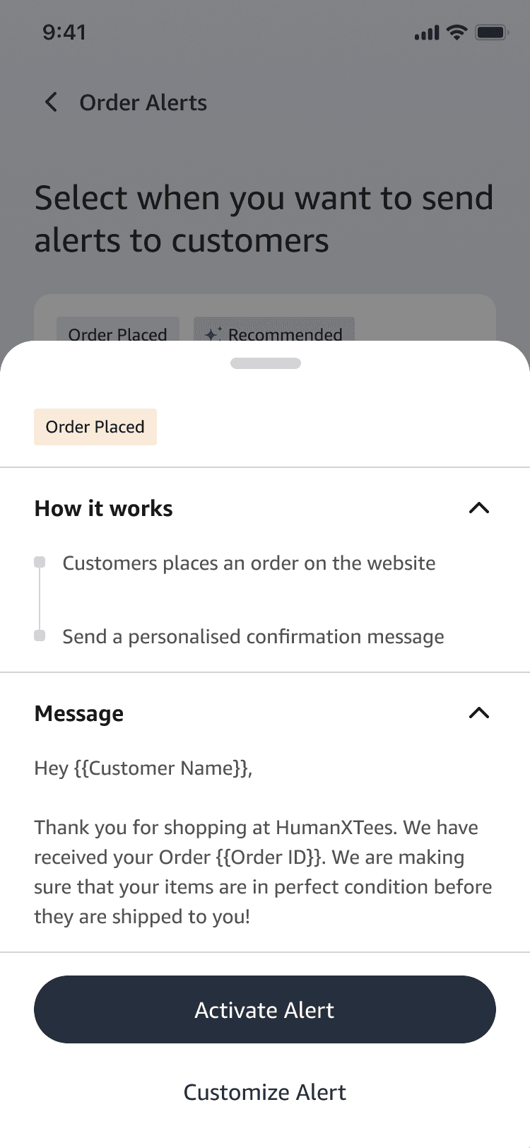 Sellers could personalize order alerts using variables like <First Name>, <Order ID>, and <Delivery Date>, making messages more relevant and engaging. The system ensured dynamic information was inserted seamlessly, with real-time previews to verify accuracy before sending.